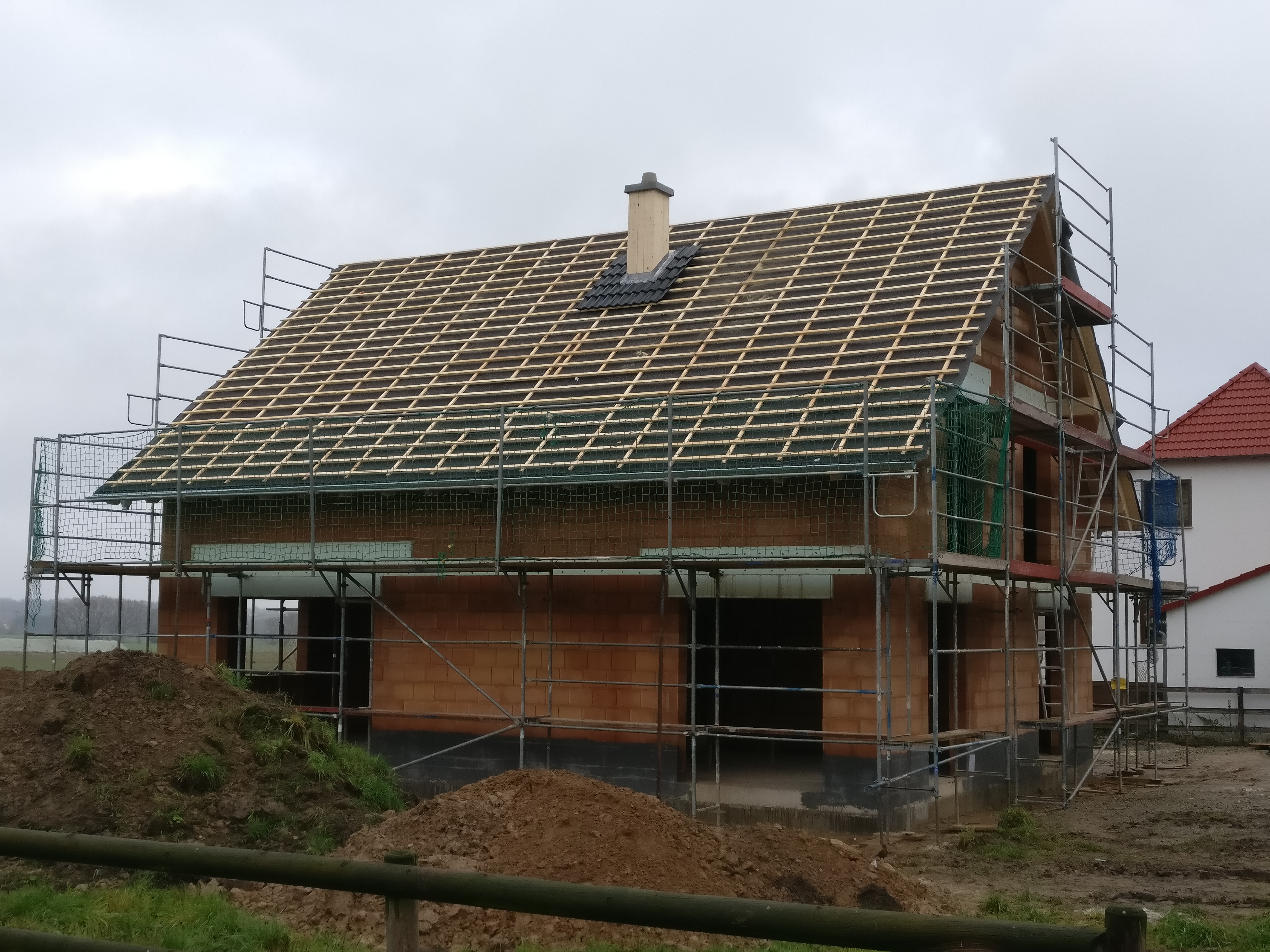 Vorheriges BildNächstes Bild IMG_20171202_103545 Freitag: Schornstein verkleidet und darum bereits begonnen einzudecken